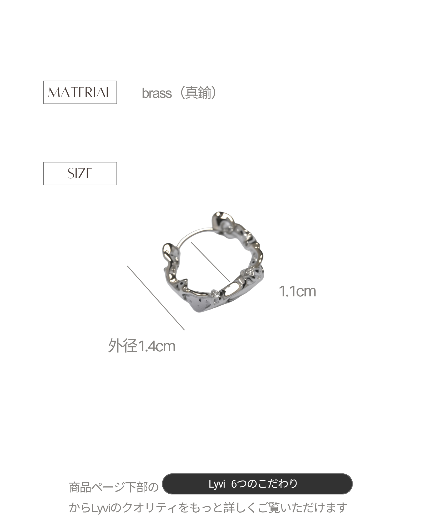 ご使用後は、柔らかい布でやさしく拭き取り、直射日光や湿気を避けた場所で保管してください。小さなケアを重ねることで、Lyviのジュエリーは、より長く、美しく寄り添います。