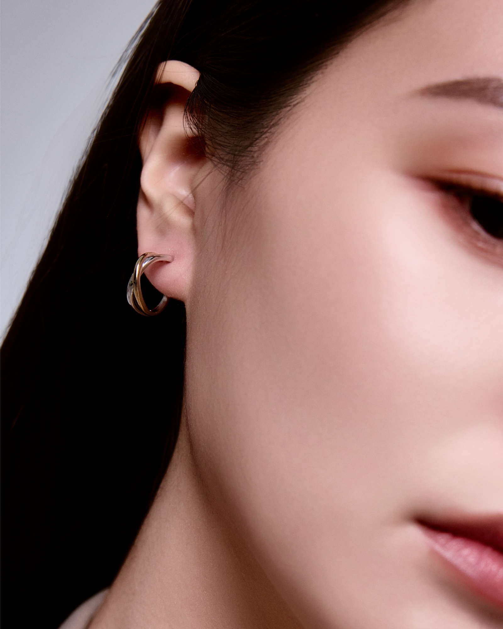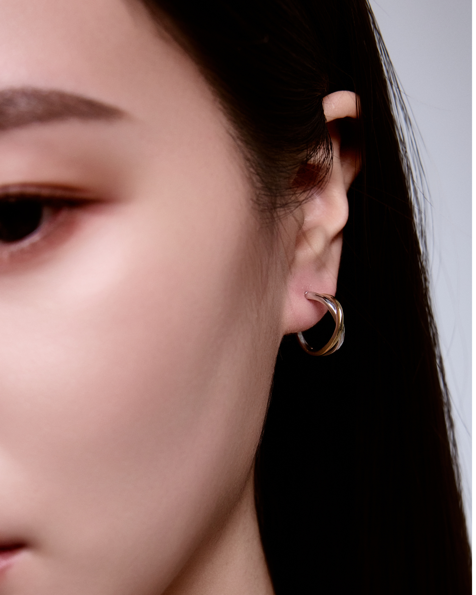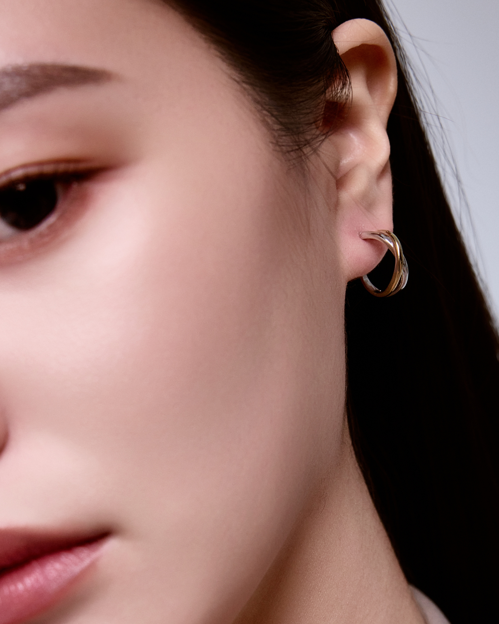 正面で交わる二重のラインが造形にリズムを刻む。アクセントゴールドとヴェールシルバーが生み出す繊細なグラデーションが造形の美しさを際立たせ、控えめなのに印象に残る仕上がりをつくります。